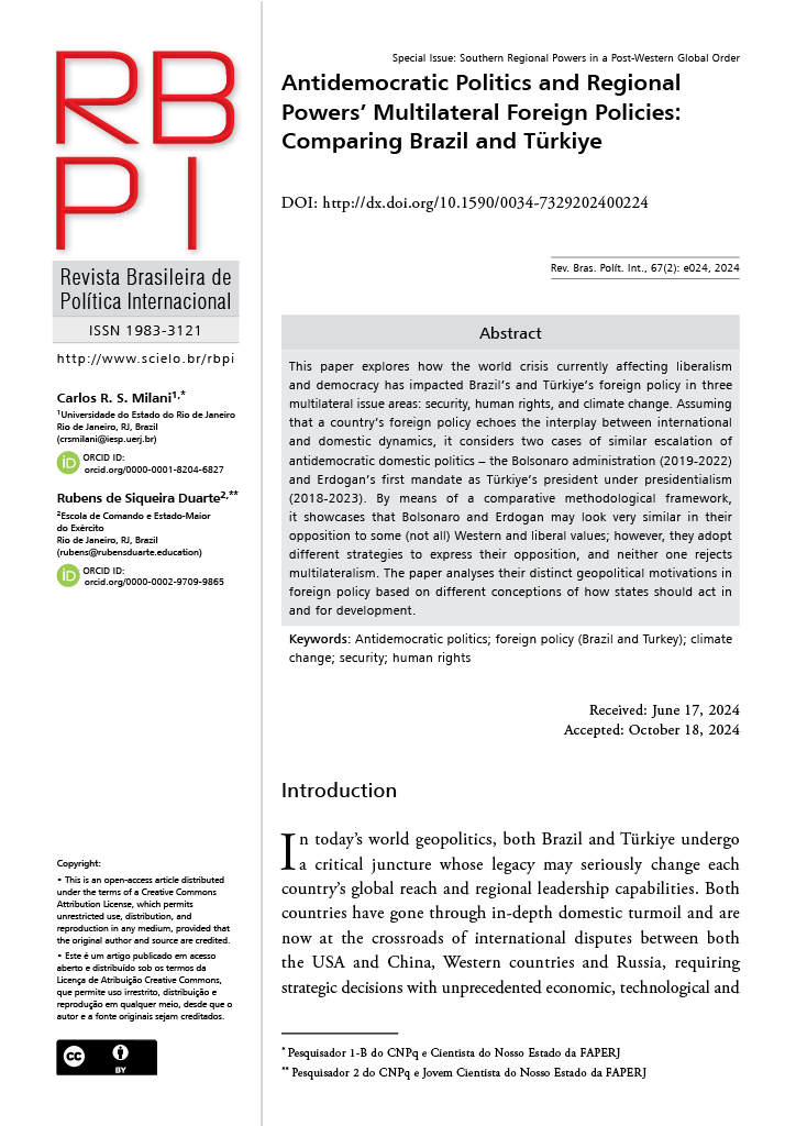 This paper explores how the world crisis currently affecting liberalism and democracy has impacted Brazil’s and Türkiye’s foreign policy in three multilateral issue areas: security, human rights, and climate change. Assuming that a country’s foreign policy echoes the interplay between international and domestic dynamics, it considers two cases of similar escalation of antidemocratic domestic politics – the Bolsonaro administration (2019-2022) and Erdogan’s first mandate as Türkiye’s president under presidentialism (2018-2023).